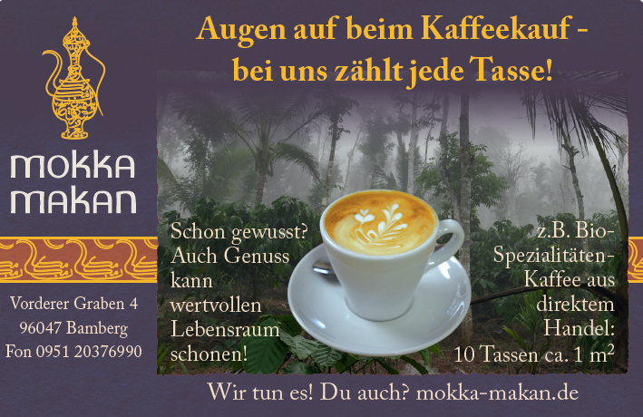 Wir bitten um formlose Anmeldung bei uns im Ladencafé, telefonisch (0951 20876990) oder per E-Mail: info@mokka-makan.de