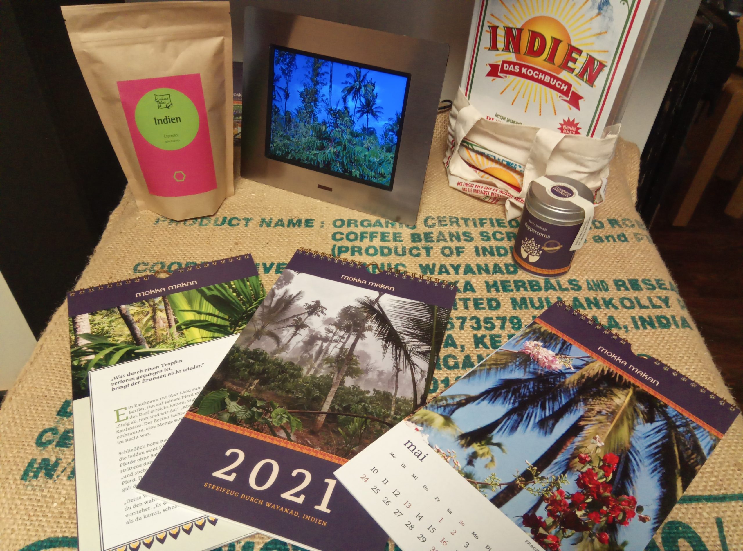 Unser Kalender mit stimmungsvollen Bildern der letzten Kaffeereise nach Indien im Januar 2020 führt gen Osten wo es so schön ist, dass man gleich dort bleiben möchte wo der Pfeffer wächst. Gespickt mit geistreichen und gewitzten indischen Erzählungen aus dem scheinbar unerschöpflichen Fundus von Rolf-Bernhard Essig bringt jeder Monat Neuigkeiten, Bilder, Geschichten und Sprichwörter. Sie bergen schillernde Wahrheiten, über die man gern länger nachdenkt.